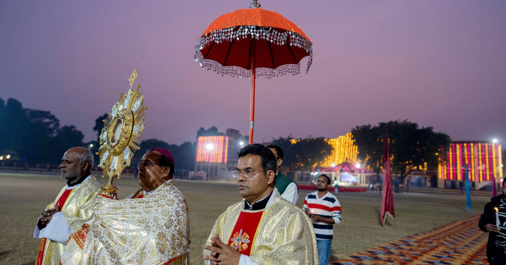 Bishop Rt. Rev, center, carries the Tabernacle in a procession to celebrate the feast of Christ the King on the last Sunday before the season of Advent at St Joseph Church in Prayagraj, India, Sunday, Nov. 23, 2025.